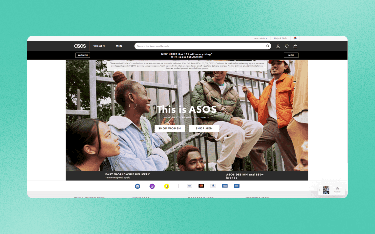 ASOS has always been ahead of its game when it comes to web design. The brand has been using bright colors and bold fonts since its launch in 2000 and continues to do so today.