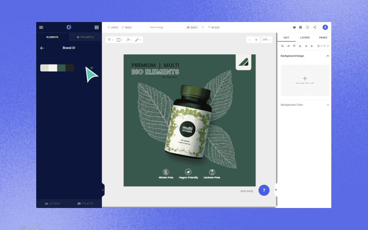 Once you choose your colors and logo, your brand kit is immediately stored, and you can insert it into any design you like. Just click on the option Brand It on the left.