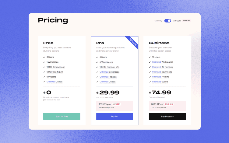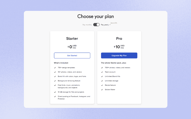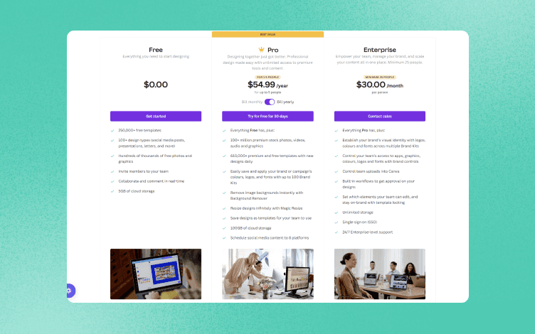 Canva offers a Free trial and 2 paid plans – Pro and Enterprise.