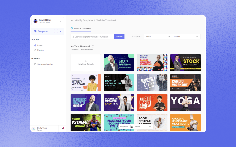 Step 1: On your dashboard, click the Headers and Covers tab and select "YouTube Thumbnails". This will open up the template library.