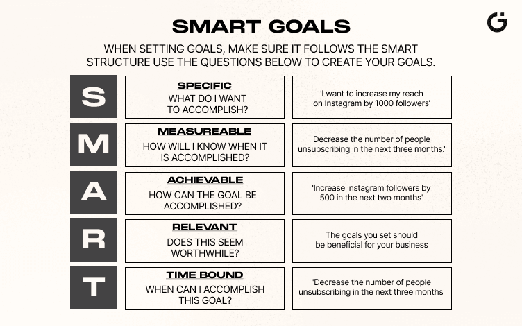 Setting realistic and achievable goals when planning your social media content strategy is essential, as this will help you gauge the necessary amount of work required.