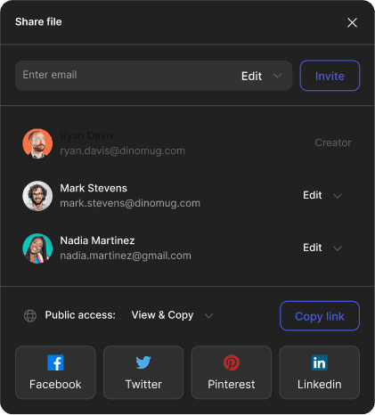 Effortlessly organise your design files. Create folders, invite your team and collaborate with ease.